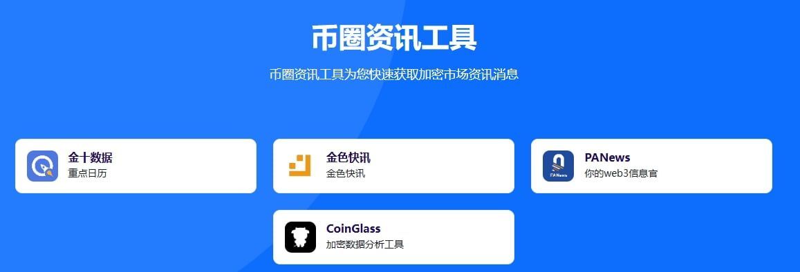 CoinGlass:一个专注于加密货币市场数据分析的平台,提供丰富的链上数据、市场情绪分析、区块链网络健康指标等工具。它为投资者、研究人员、交易员及机构提供深度的市场洞察,帮助他们做出更为准确的决策。金十数据:提供全球金融市场资讯与数据服务的平台,尤其以外汇、数字货币、股市和大宗商品等领域的实时市场动态与数据分析为特色。金十数据汇集了全球范围内的金融数据和资讯,致力于为投资者、交易员及金融从业者提供精准、及时的信息,帮助其做出更为明智的决策。金色财经:专注于为用户提供全球范围内的加密货币新闻、行情分析、市场动态、区块链技术、投资理财等资讯。自成立以来,金色财经致力于为全球的数字货币爱好者、投资者、开发者和行业从业者提供全面、及时、精准的行业资讯及数据服务,成为区块链和加密货币领域的权威媒体之一。PANews:致力于为全球区块链行业的从业者、投资者、开发者提供最新的行业资讯、深度报道、技术分析、市场动态以及项目研究等服务。PANews自成立以来,以其精准的市场观察和独立的新闻报道,在区块链和加密货币领域积累了广泛的影响力,成为了业内知名的新闻平台之一。